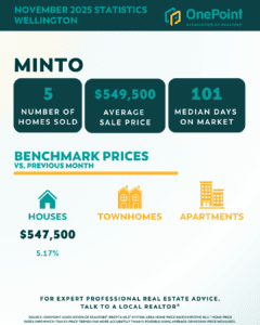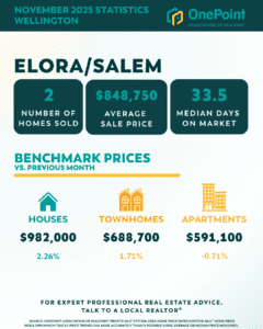 In Centre Wellington, sales activity was more subdued, with 27 homes sold and an average sale price of $754,167. The median days on market sat at 34 days, indicating buyers are taking a bit more time before committing. Benchmark prices showed mixed results across the area. Houses increased 2.25% to $870,700, while Townhomes saw a notable decline of -10.75% to $619,300. Apartments remained relatively flat, ticking up 0.10% to $514,800.