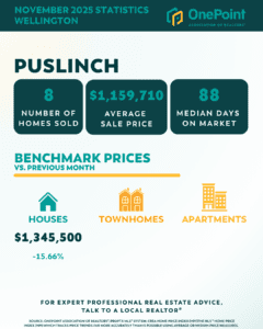 Looking deeper into Centre Wellington’s communities, activity varied by township. Fergus and Elora saw modest sales volumes with relatively stable pricing, while rural areas such as Puslinch and Guelph/Eramosa experienced lower sales counts and longer days on market, which can contribute to larger month-to-month price swings due to limited data.
